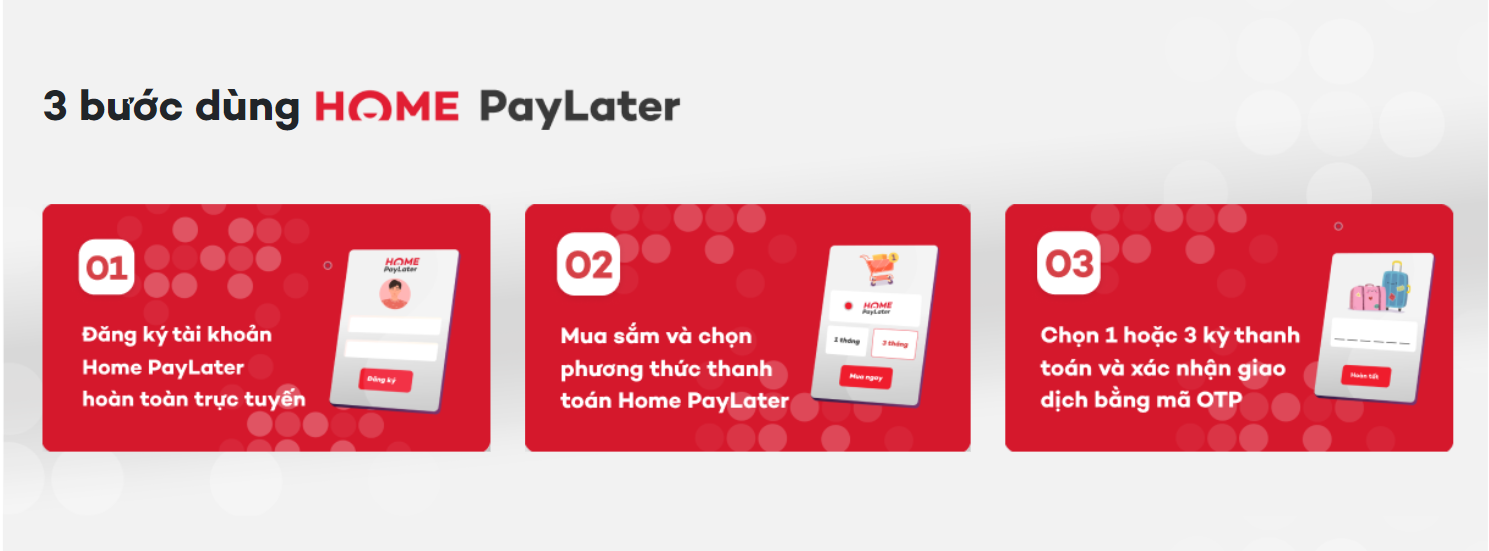 • Thanh toán định kỳ hàng tháng qua ứng dụng Home PayLater hoặc các kênh thanh toán được hỗ trợ như ví điện tử, chuyển khoản ngân hàng.